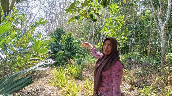 Farida menunjuk tumbuhan yang ia tanam di samping rumahnya. Ada ubi, pisang, pohon-pohon berbuah dan tanaman lain yang menjadi sumber pangan utama keluarganya. Farida dan suaminya kesulitan mencari nafkah setelah kebun mereka seluas 2 hektare diklaim masuk wilayah konsesi PT SRL (dok:Rinai/BNEWS)