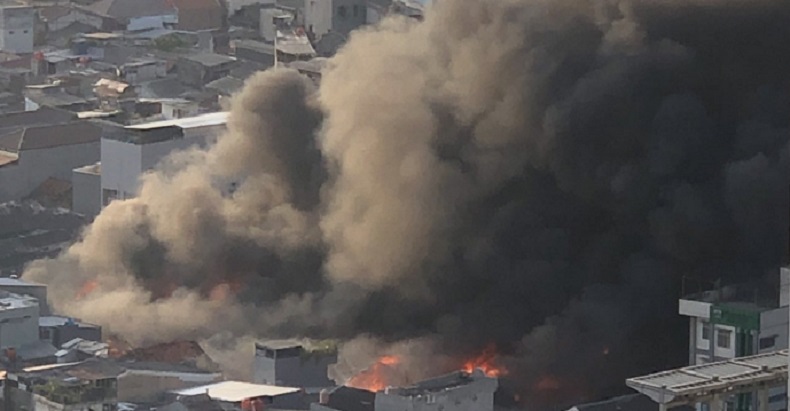 Sampai pukul 18.00 WIB, asap tebal akibat kebakaran menyelimuti lokasi. Saat ini terlihat petugas pemadam masih berjibaku menjinakan api. Lokasi di sekitar kebakaran juga gelap karena diselimuti asap.
