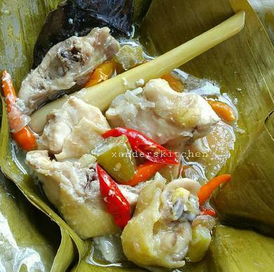 1 ekor ayam kampung muda (1,2 Kg) 1 jeruk nipis 200 ml santan encer 3 batang sereh, memarkan 4 lembar daun salam 5 buah belimbing wuluh, potong-potong 2 buah tomat hijau, potong-potong 10 buah cabai rawit, biarkan utuh (sesuka selera) daun pisang secukupnya untuk membungkus