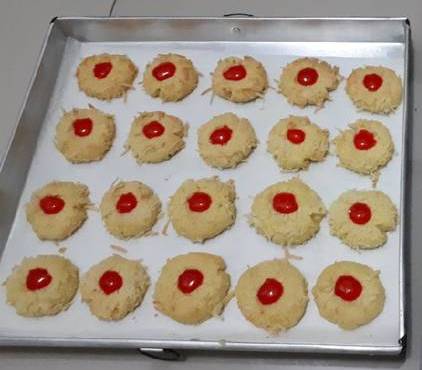 3. Bentuk adonan menjadi bola-bola kecil. Susun di loyang datar. Tekan dengan punggung sendok, hingga terbentuk cerukan di tengah kue.