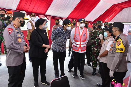 BNEWS - Panglima TNI Marsekal Hadi Tjahjanto bersama Kapolri Jenderal Listyo Sigit Prabowo dan Ketua DPR RI Puan Maharani, meninjau posko penyekatan check point Pelabuhan Bakauheni Lampung.