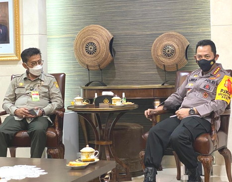 BNEWS - Kapolri Jenderal Listyo Sigit Prabowo menerima kedatangan Menteri Pertanian Syahrul Yasin Limpo bersama jajaran di Ruang Rapat Kapolri, Mabes Polri, Jakarta, Senin (17/5/2021).