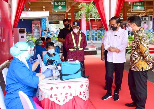 “Di sini para pelaku transportasi yang divaksin, baik supir, kernet, baik usaha kecil dan usaha mikro yang berada di terminal dan sekitarnya. Pada pagi hari ini dilakukan vaksinasi kurang lebih 1.000 orang,” kata Kepala Negara usai peninjauan.