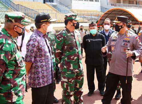 BNEWS - Panglima TNI Marsekal Hadi Tjahjanto dan Kapolri Jenderal Listyo Sigit Prabowo serta Menteri Kesehatan Budi Gunadi Sadikin, meninjau vaksinasi massal di Stadion Gelora Bandung Lautan Api, Jawa Barat, Kamis (17/6/2021).
