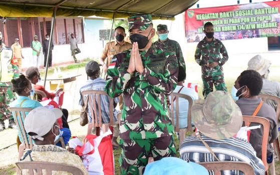 BNEWS - Danrem 174/ATW Merauke Brigjen TNI Bangun Nawoko, didampingi pejabat Korem, membagikan bantuan sembako dari Presiden untuk masyarakat Merauke, bertempat di Kampung Kamangi, Distrik Tanah Miring, Kabupaten Merauke, Senin (06/09/2021).