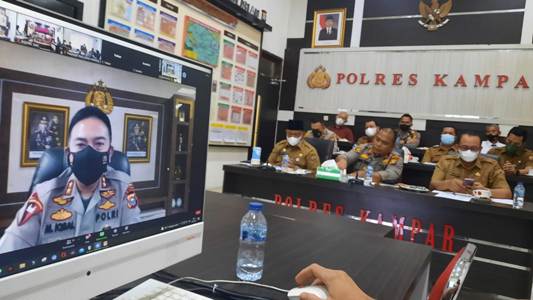 Dari Kabupaten Kampar telekonference ini diikuti langsung oleh Sekda Kampar Drs Yusri dan jajaran, Kapolres Kampar AKBP Rido Rolly Parsaoran Purba dan para Pejabat Utama Polres Kampar, dari ruang Zoom Meeting Polres Kampar.