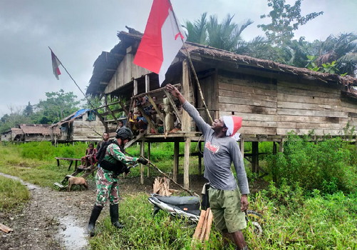 BNEWS - Meningkatkan semangat kebangsaan, Prajurit TNI Satgas Pamtas Yonif Raider 142/KJ Pos Kekey, mengajak warga Kampung Bruto, Distrik Dekay, Kabupaten Yahukimo, Pegunungan Tengah Papua, mengibarkan Bendera Merah Putih di rumah mereka.