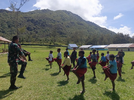 BNEWS - Personel TNI Satgas Pamtas Yonif Raider 142/KJ melalui Pos Bolakme melatih senam pagi pelajar Sekolah Dasar (SD) Inpres Distrik Bolakme, Kabupaten Jayawijaya, Papua Pegunungan Tengah.
