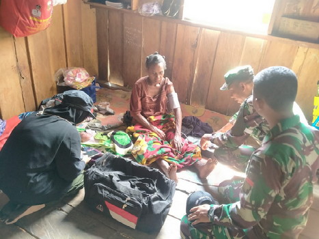 BNEWS - Tim Kesehatan Satgas Pamtas Yonif 126/KC Pos KM 31, mengobati Enjelina Pull (35) yang sedang sakit. Enjelina adalah warga Kampung Somografi, Distrik Web, Kab. Keerom, Papua.