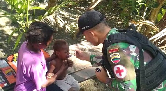BNEWS - Untuk mencegah terjadinya gizi buruk di wilayah perbatasan Papua, Tim Kesehatan Satgas Pamtas Yonif 126/KC Pos Karang berkeliling memberikan sirup multivitamin kepada anak-anak di Kampung Kalipao, Distrik Waris, Kab. Keerom.