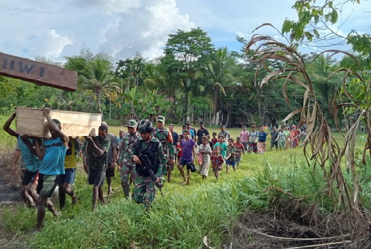 BNEWS - Personel TNI Satgas Yonif 126/KC Pos Batom yang dipimpin Komandan Pos (Danpos) Letda Inf Henri Capah, ikut melayat ke rumah warga binaan yang meninggal dan membantu proses pemakaman di Kampung Batom, Distrik Batom, Kabupaten Pegunungan Bintang, Papua.