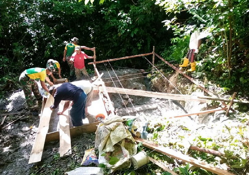 BNEWS - Personel TNI Satgas Satuan Organik Yonarmed 1 Kostrad, mengerahkan prajurit dari Posramil Tuhaha, untuk membantu warga membangun bak penampungan air di Negeri Tuhaha, Kecamatan Saparua Timur, Maluku Tengah.