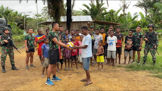 BNEWS - Semangat dalam kebersamaan dengan masyarakat di wilayah perbatasan Papua, Personel Satgas Pamtas Yonif 126/KC Pos Yuruf gelar olahraga voli dipimpin Danpos Yuruf Sertu Zulham Evendi sekaligus memberikan bantuan net dan bola voli kepada pemuda dan masyarakat Kampung Yuruf, Distrik Yaffi, Kabupaten Keerom.