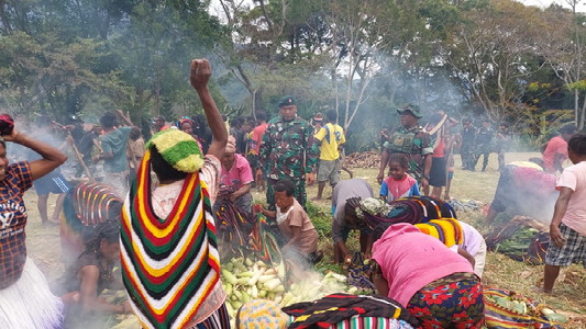 BNEWS - TNI Satgas Pamtas Yonif Raider 142/KJ bersinergi bersama Koramil Kelila mengikuti acara bakar batu bersama masyarakat Kampung Timeria, Distrik Kelila, Kabupaten Mamberamo Tengah, Papua Pegunungan Tengah, Kamis (29/09/2022).