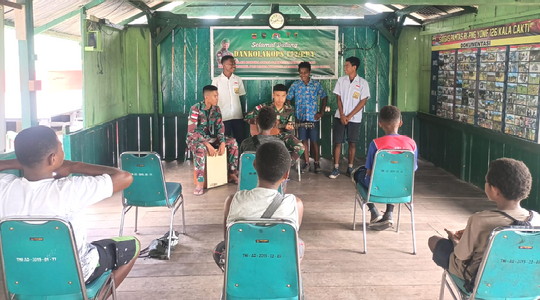 BNEWS - Disamping melaksanakan tugas pokok mengamankan perbatasan RI-PNG, Satgas Yonif 126/KC melaksanakan perannya dalam pemberdayaan anak-anak Papua di perbatasan melalui program kreatif berupa pelatihan alat musik bertempat di aula Kala Cakti Pos Kotis Senggi.