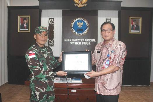 Kepala BNN Provinsi Papua Drs. Rahmat Hidayat memberikan penghargaan secara simbolis yang diterima langsung oleh Dansatgas Pamtas Yonif 126/Kala Cakti, Letkol Inf Dwi Widodo, di Kantor BNN, Jayapura, Provinsi Papua.