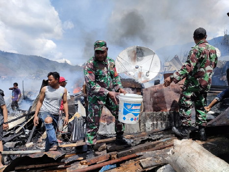 BNEWS - Sebanyak 30 prajurit TNI personel Kodim 1714/Puncak Jaya, Papua, dipimpin langsung Dandim Letkol Inf Denny Salurerung, bersama masyarakat berjibaku memadamkan api yang melahap bangunan Pasar Kota Baru.