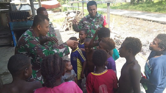 BNEWS - Babinsa Koramil 1710-07/Mapurujaya, Serma Bambang, terlihat asik bersama anak-anak, saat bermain di depan kios, di Kampung Mwuare, Distrik Mimika Baru, Kabupaten Mimika, Papua, Selasa (18/10/2022).