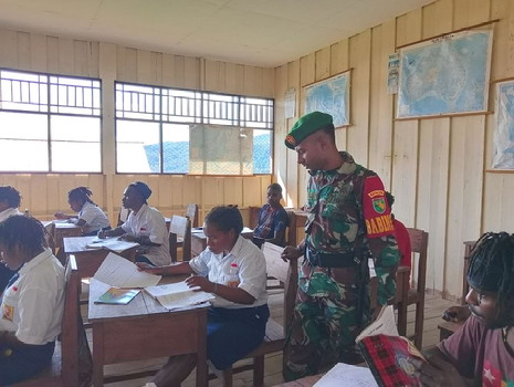 BNEWS - Mendukung perkembangan pendidikan di wilayah binaannya, Babinsa Koramil 1710-05/Jila, dipimpin Sertu Rusef, membantu pengawasan ujian semester ganjil di SD Inpres Jila, Senin (31/10/2022).