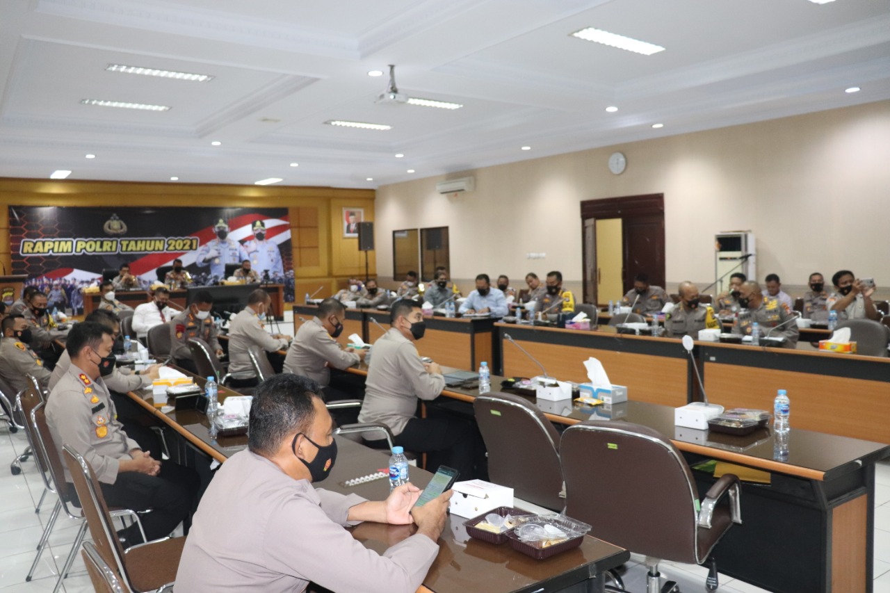 SERANG - Kepolisian Daerah (Polda) Banten hadiru Rapat Pimpinan (Rapim) Polri tahun 2021, melalui video conference yang dilaksanakan di aula Rupatama Mapolda Banten, Rabu (17/02/2021).