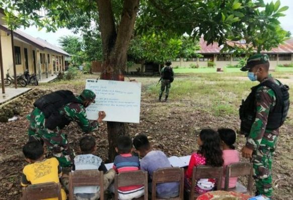 Prajurit TNI Beri Bimbingan Belajar Anak-anak di Perbatasan RI-PNG Jumat, 19/02/2021 | 06:49