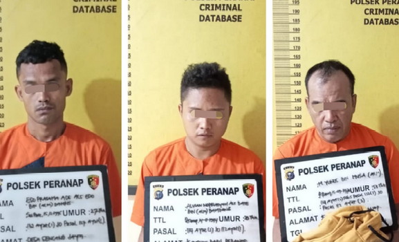 Ketiga tersangka, MY (53) warga Desa Pauh Ranap, Kecamatan Peranap, AN (29), warga Kelurahan Peranap dan EP (28), warga Desa Sencano Jaya, Kecamatan Batang Peranap, dibekuk unit Reskrim Polsek Peranap, Sabtu 10 Juni 2023, di perumahan Pondok III PT. Indriplant, Desa Pauh Ranap.