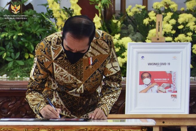 Dalam kegiatan ini Presiden Jokowi melakukan penandatanganan Sampul Hari Pertama Prangko Seri Vaksinasi Covid-19.