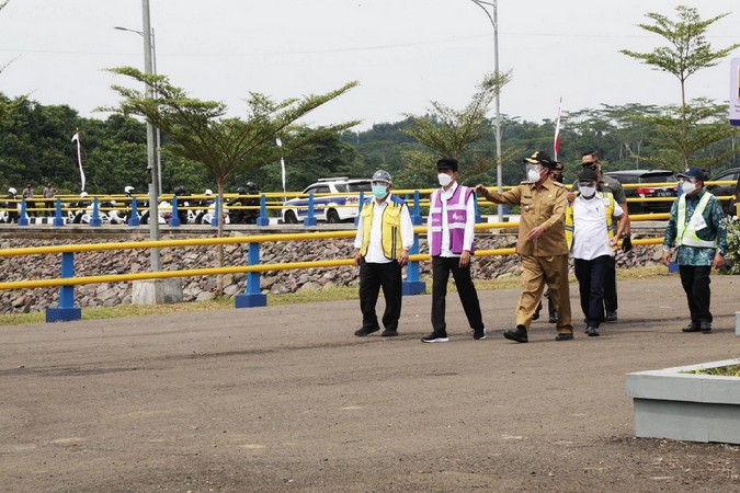 Usai peresmian yang dilakukan dengan menerapkan protokol kesehatan, dilanjutkan peninjauan bendungan oleh Presiden Jokowi didampingi sejumlah menteri.**/ril