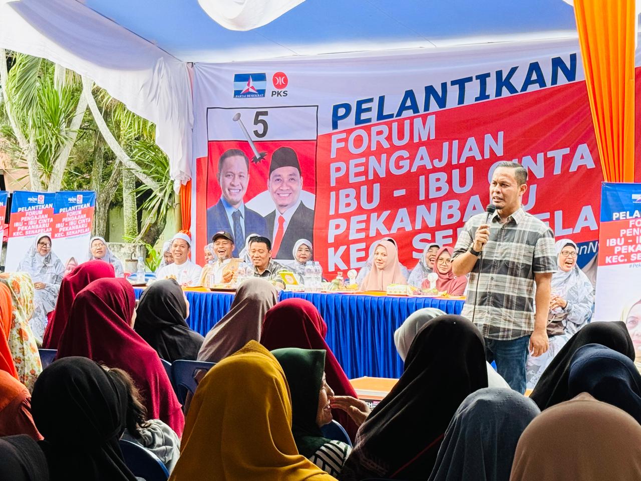 BNEWS - Calon Walikota dan Wakil Walikota Pekanbaru nomor urut lima, Agung Nugroho dan Markarius Anwar menghadiri kegiatan kampanye dialogis sekaligus pelantikan Forum Pengajian Ibu-ibu Cinta Pekanbaru (Forcintaku) Kecamatan Senapelan bertempat di Jalan Bangka, Kelurahan Sago, Kecamatan Senapelan, Jumat (25/10). Disini, Paslon AMAn memperkenalkan Aplikasi AMAn Transportasi kepada warga Senapelan.