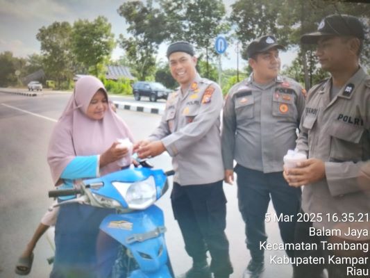 BNEWS - Polsek Tambang, Polres Kampar, menunjukkan kepeduliannya terhadap masyarakat dengan membagikan takjil gratis di Jalan Lintas Pekanbaru-Bangkinang KM 30, tepatnya di depan Mako Polsek Tambang Rabu (05/03/2025) sore.