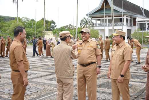 BNEWS - Hari pertama kerja pasca libur dan cuti bersama Idul Fitri 1446 Hijriyah, Pemerintah Kabupaten (Pemkab) Siak menggelar apel pagi perdana di halaman Kantor Bupati Siak, Selasa (8/4/2025).