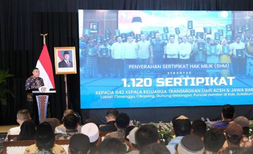 Ia juga menyampaikan apresiasi kepada Pemerintah Daerah Sukabumi dan Kementerian Transmigrasi atas kerja sama lintas sektor yang telah mempermudah proses sertifikasi tanah bagi para transmigran.