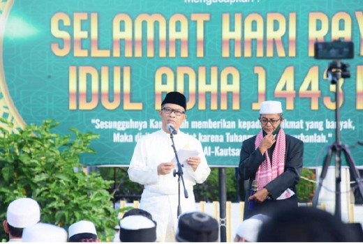 BNEWS - Wakil Bupati Bengkalis H Bagus Santoso bersama istri, keluarga dan masyarakat sekitarnya melaksanakan sholat Idul Adha 1443 H, di lapangan Tugu Bengkalis, Minggu (10/7/2022).