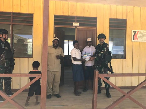 BNEWS - Personel TNI Satgas Yonif Mekanis 203/AK Pos Balingga, Kabuputen Lanny Jaya, Papua, terus membantu memajukan dunia pendidikan di SMPN 1 Balingga Desa Binolanggen, dengan memberikan bantuan alat tulis