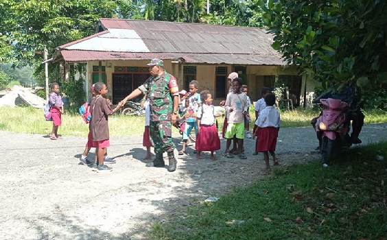 Babinsa dan pelajar SD di Timika |