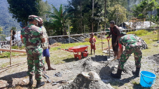 BNEWS - Mewujudkan terjalinnya kerja sama di berbagai bidang, Babinsa Koramil Beoga, Kabupaten Puncak Jaya, Papua, diwakili Serda Ronal dan Pratu Doni, melaksanakan karya bhakti, membantu pembangunan gedung SMPN 1 Beoga, Jumat (16/12/2022).