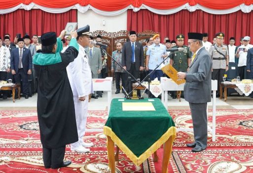 BNEWS - Suhardiman Amby mulai hari ini sah sebagai bupati definitif Kabupaten Kuantan Singingi (Kuansing), setelah secara resmi dilantik Gubernur Riau Syamsuar, di Gedung Daerah Balai Serindit, Jumat (14/7/2023).