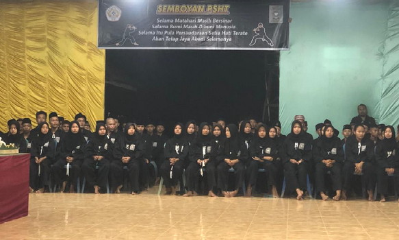 BNEWS - Perguruan Silat Persaudaraan Setia Hati Terate (PSHT) Cabang Indragiri Hulu (Inhu) gelar acara pengesahan warga baru di Desa Titian Resak, Kecamatan Siberida, Selasa malam (1/8/2023).