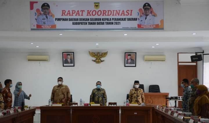 TANAH DATAR - Bupati Tanah Datar Eka Putra didampingi Wakil Bupati Richi Aprian, memipimpin Rapat Koordinasi (Rakor) perdana dengan Kepala Organisasi Perangkat Daerah (OPD) se-Kabupaten Tanah Datar, di Aula Kantor Bupati, Kamis (04/03/21).