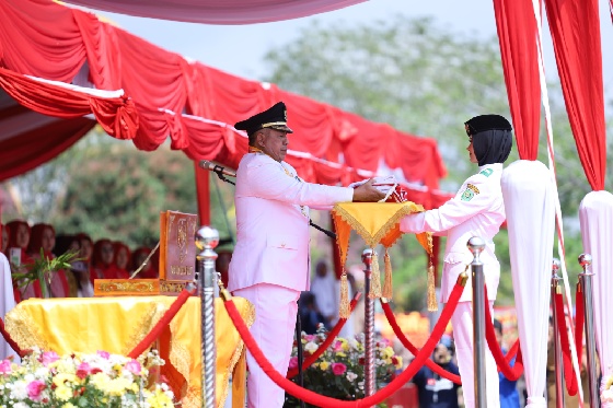 Langkah tegap dan pandangan lurus menatap Bupati, siswi SMAN 1 Siak tersebut berjalan tanpa ragu-ragu. Langkah kaki Vania perlahan menaiki anak tangga untuk mengambil Sang Saka Merah Putih.