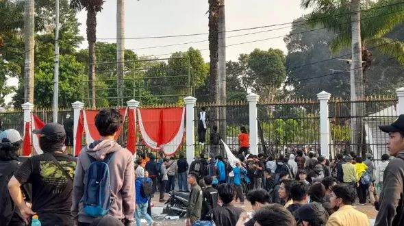 BNEWS - Aksi massa demonstran yang menolak RUU Pilkada 2024 mulai ricuh dan massa merangsek ke area gedung DPR/MPR, Kamis (22/8/2024) sore. Terlihat massa masuk melalui pagar bagian kiri dan kanan gedung DPR. Massa memanjat hingga masuk ke area DPR.