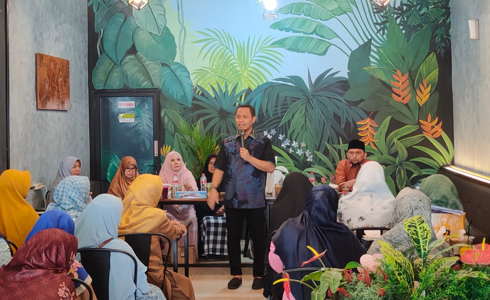 BNEWS - Bakal Calon Walikota Pekanbaru Agung Nugroho menemui puluhan anggota Forum Pengajian Ibu-ibu Pecinta Pekanbaru (Forcintaku) di Leng Coffe, Rabu (4/9/2024) pagi.