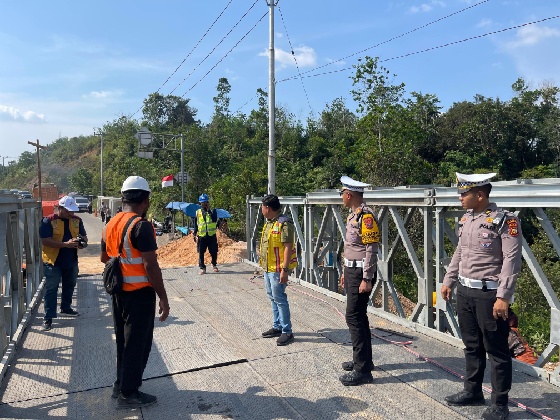 BNEWS - Polres Kampar melalui Satlantas Polres Kampar melaksanakan uji coba jembatan Bailey di KM 106/107, di lokasi jalan yang amblas di Desa Tanjung Alai XIII Koto Kampar.