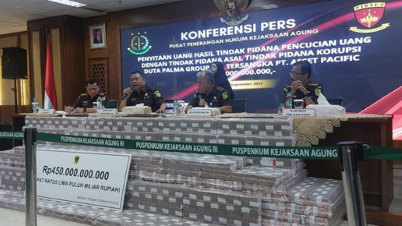 BNEWS - Kejaksaan Agung (Kejagung) menyita uang Rp 450 miliar terkait dugaan korupsi korporasi PT Duta Palma Group. Kejagung mengatakan uang disita dari PT Asset Pacific yang masih satu grup dengan Duta Palma. Uang tersebut disita karena diduga merupakan tindak pidana pencucian uang (TPPU) dari hasil korupsi.