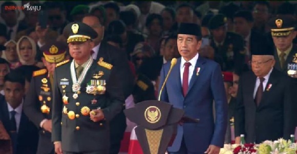 Presiden Jokowi memimpin jalannya upacara HUT TNI ke-79. Selaku Inspektur Upacara, didampingi oleh Panglima TNI dan Kepala Staf Angkatan KSAD, KSAL, dan KSAU.