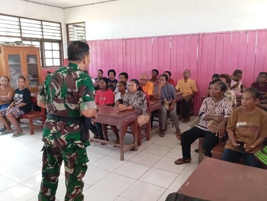 BNEWS - Memperkuat rasa cinta tanah air dan meningkatkan wawasan kebangsaan di kalangan masyarakat, Satgas TMMD Ke-122 Kodim 1805/Raja Ampat memberikan penyuluhan wawasan kebangsaan kepada warga Kampung Saporkren, Distrik Waigeo Selatan, Kab. Raja Ampat, Rabu (16/10/2024).