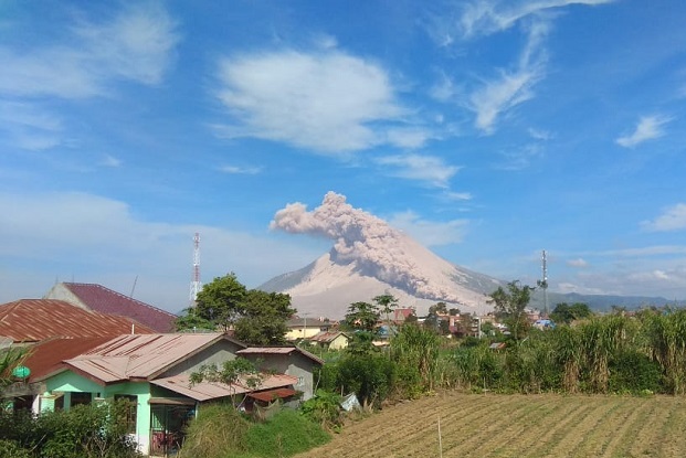 SUMUT - Hari ini, Kamis (11/3/2021) Gunung Sinabung di Kabupaten Karo, Provinsi Sumatera Utara (Sumut) kembali erupsi sebanyak dua kali dan menciptakan kolom abu setinggi 1.000 meter dan disertai guguran awan panas sejauh 3 km.