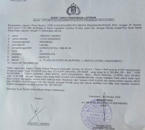 Dalam pengaduan tertanggal 30 Oktober 2024 yang dibuat Vincent Limvinci, dituliskan bahwa AA telah melakukan perbuatan curang, yakni terhadap rumah miliknya di Jalan Delima, Tobek Godang, Pekanbaru.