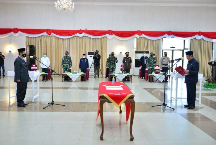 PEKANBARU - Gubernur Riau (Gubri) Syamsuar resmi melantik dan mengukuhkan Masrul Kasmy menjadi Penjabat (Pj) Sekretaris Daerah Provinsi (Sekdaprov) Riau di Gedung Daerah Balai Serindit, Jumat (12/3/2021).