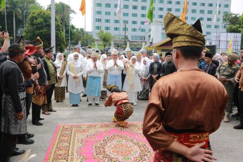 BNEWS - Rombongan kepala daerah dan wakil kepala daerah se Riau yang baru saja tiba di Pekanbaru usai mengikuti retret, disambut dengan upacara adat di begitu menapakkan kakinya di Bumi Lancang Kuning.